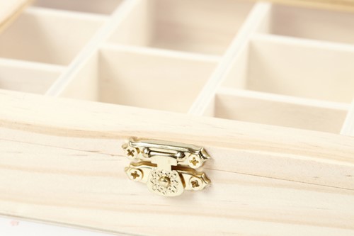 Houten doos met glazen deksel en metalen sluiting verdeeld in 10 vakken in 2 maten. Ideaal voor decoratie met acrylverf, porseleinstiften, mozaïek en nog veel meer! Afmetingen:15,5x20,5x3,5 cm.
