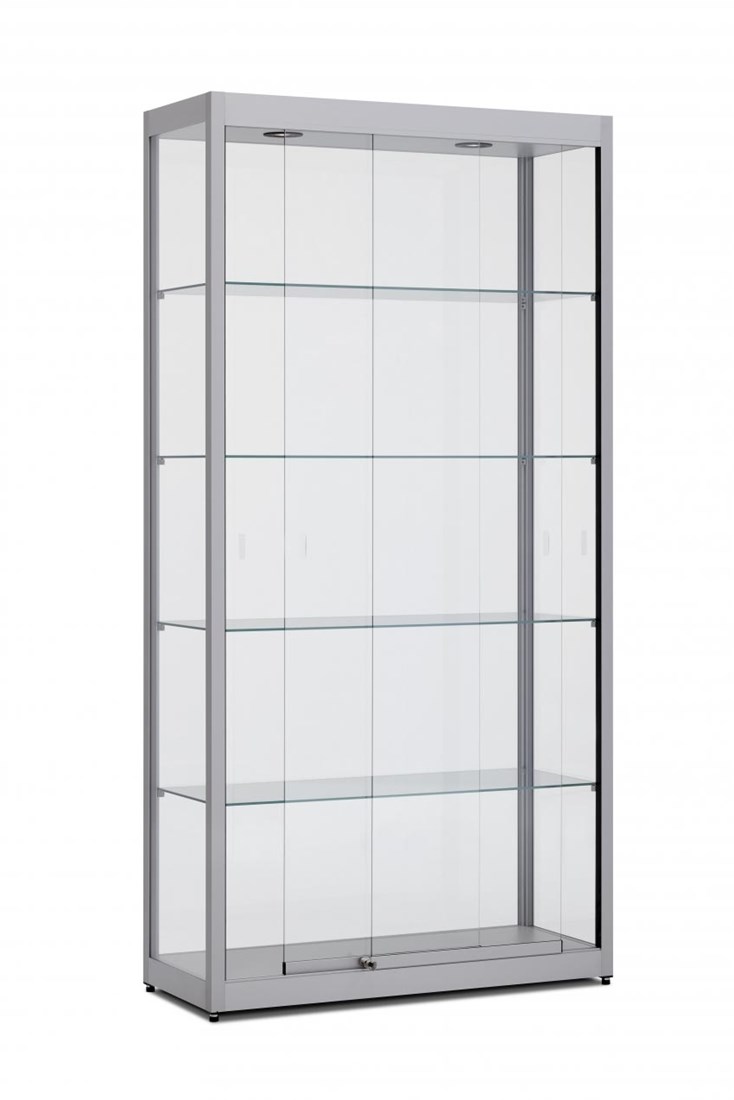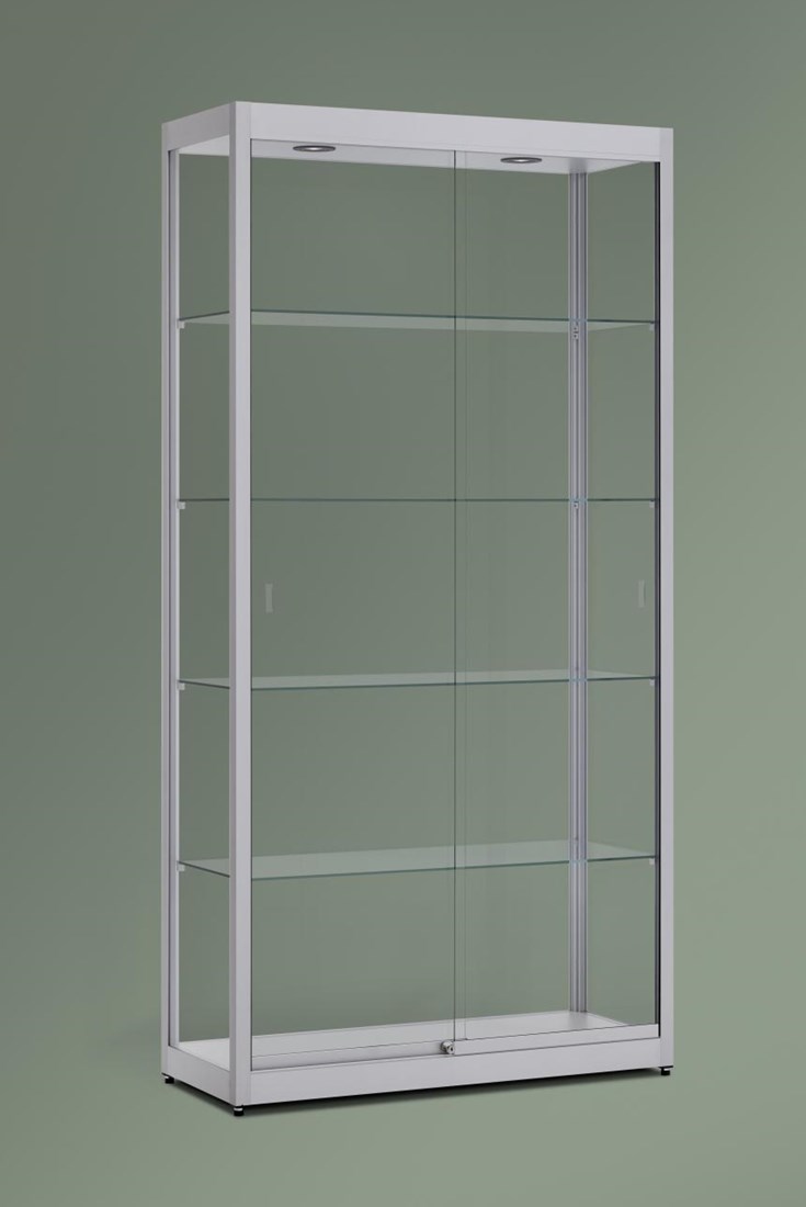De vitrinekast combineert een moderne uitstraling met praktische functionaliteit. Door de verstelbare glazen legborden richt je de kast flexibel in, terwijl de afsluitbare deuren zorgen voor een veilige presentatie. Afhankelijk van de gewenste uitstraling is de kast leverbaar in zwart of aluminium geanodiseerd aluminium.