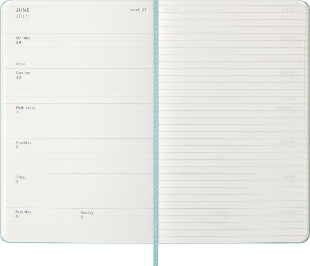 De Moleskine 18 Maanden Weekly Notebook Planner loopt van juli tot december. Deze populaire planner is ingedeeld om de afspraken van de week aan de linkerkant weer te geven en heeft een gelinieerde pagina voor notities en ideeën aan de rechterkant. Hierdoor is het notebook perfect voor studenten, docenten en professionals. De planner heeft een harde of zachte kaft met afgeronde hoeken en een elastische sluiting.