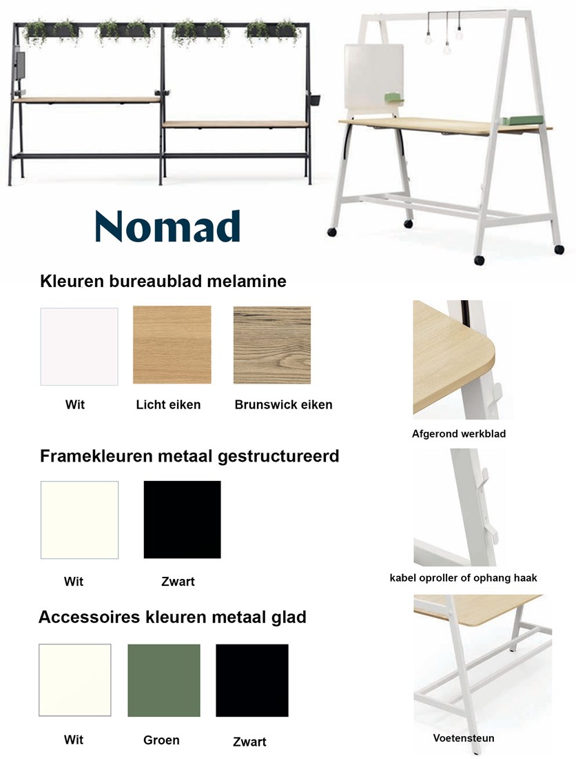 Het melamine werkblad is leverbaar in drie uitvoeringen: wit, naturel eiken en brunswick eiken. Het frame en de poten zijn uitgevoerd in gestructureerd metaal en beschikbaar in zwart of wit. Optionele accessoires zijn verkrijgbaar in zwart, wit of groen metaal, zodat het zit sta bureau eenvoudig afgestemd kan worden op de inrichting van de werkruimte.