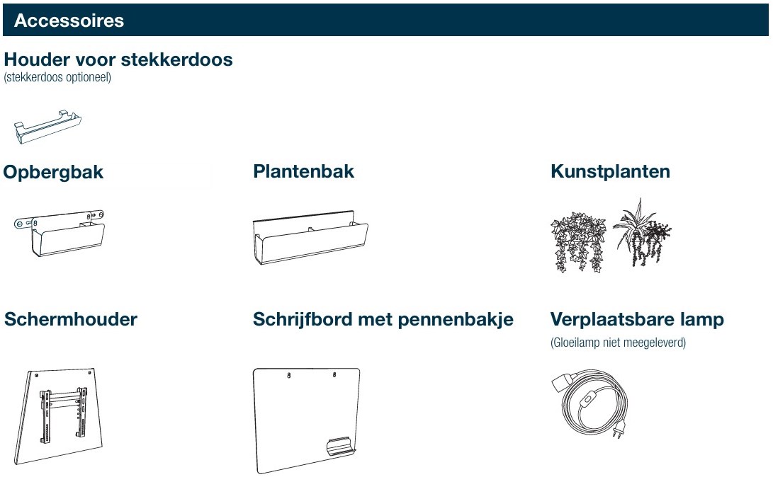 - Plantenbak – Geschikt voor kunstplanten (apart verkrijgbaar). Te plaatsen op de bovenste dwarsbalk, maximaal 4 plantenbakken per tafel. Voorzien van 2 compartimenten. Bruikbare afmetingen: 2 x B. 29,4 x H. 18,5 x D. 12,9 cm.