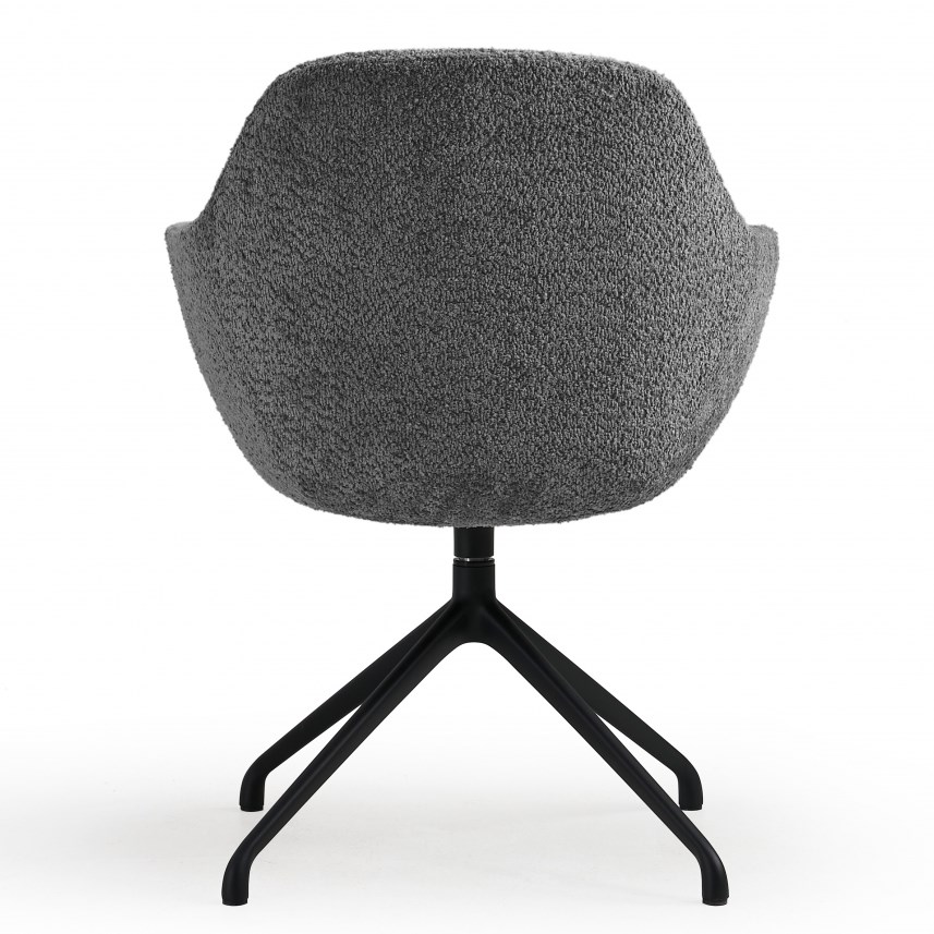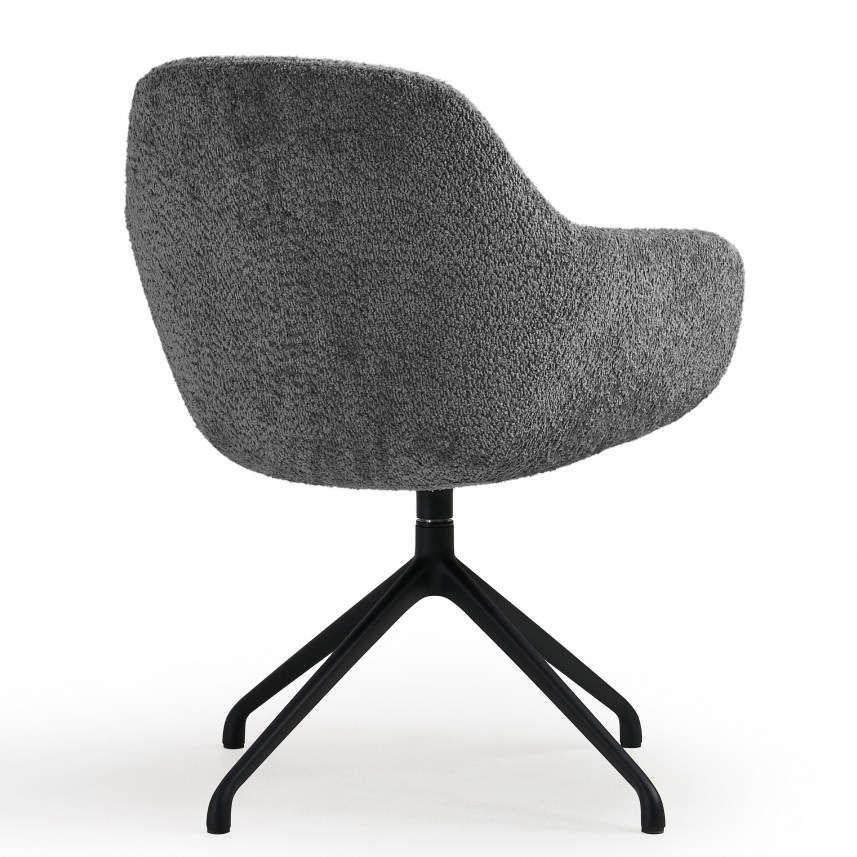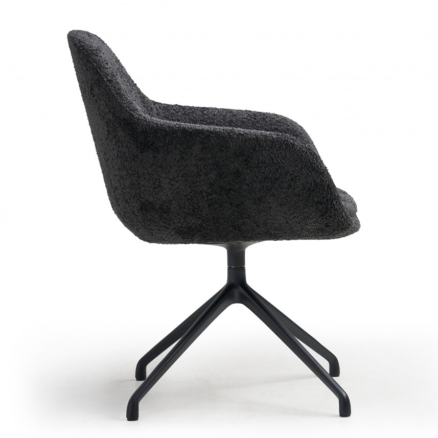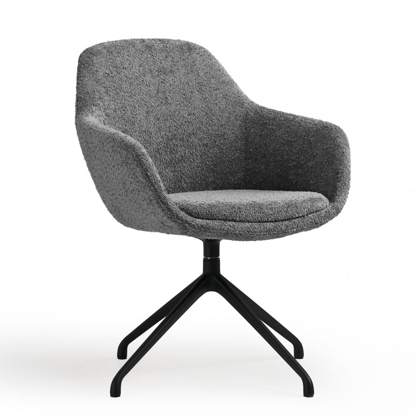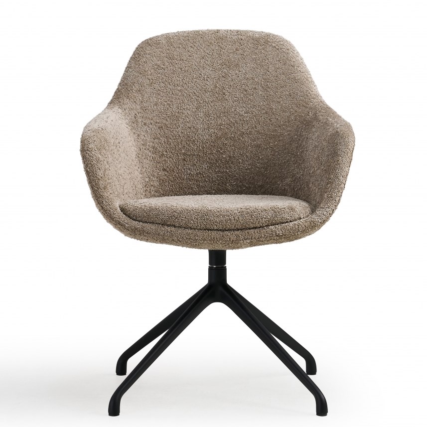 De draaifauteuil staat op een stabiele vierpoots spinpoot van zwart gelakt staal en kan volledig draaien. Dit maakt de stoel ideaal voor informele gesprekken, overlegmomenten en wachtruimtes waar bewegingsvrijheid prettig is. Het hoogwaardige gevormde schuim zorgt voor langdurig zitcomfort terwijl de luxe teddy stof een warme en hoogwaardige uitstraling geeft.