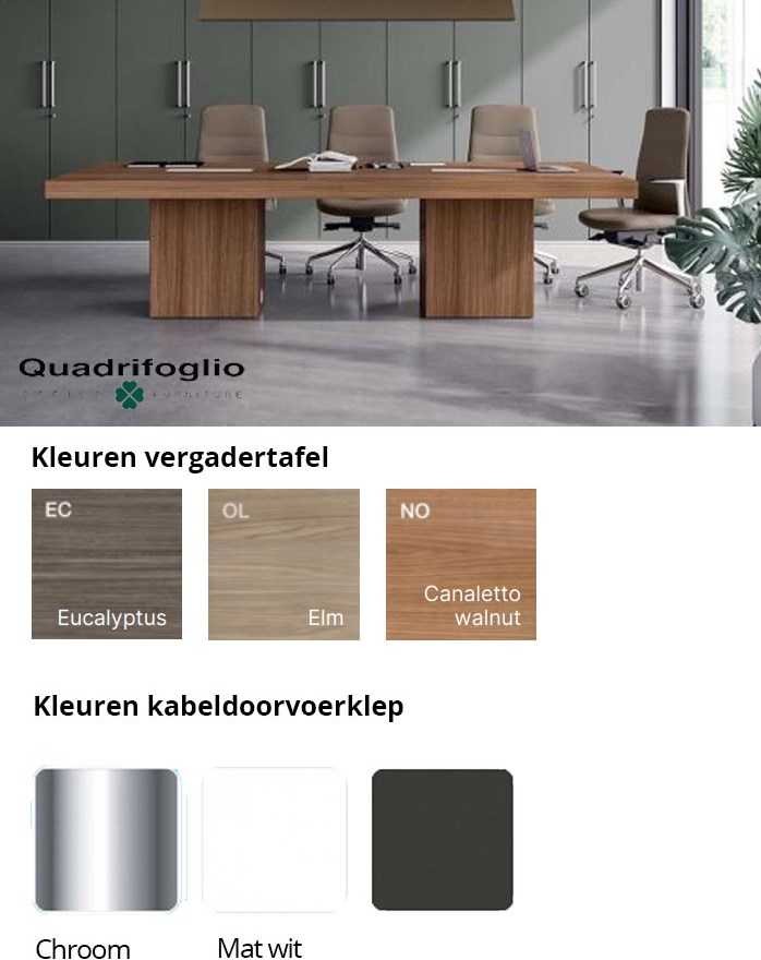 De vergadertafel is verkrijgbaar in verschillende bladkleuren en afwerkingen, waaronder eucalyptus, elm en canaletto walnoot. Deze natuurlijke houttinten zorgen voor een warme en professionele uitstraling. Het onderstel is beschikbaar in onder andere mat wit, umbra grijs en chroom, waardoor u de tafel volledig kunt afstemmen op uw interieur.Bekijk ook het bijpassende Quadrifoglio T45 directiebureau.
