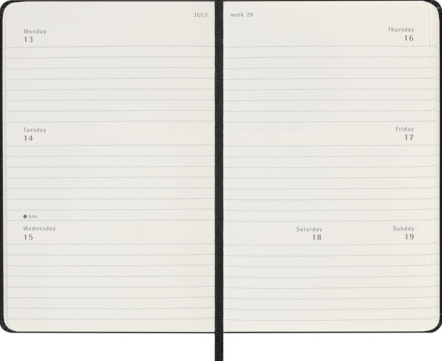 De Moleskine Horizontal Weekly Planner is gedateerd van januari tot december. Deze populaire planner is ingedeeld in een horizontaal formaat om elke week op twee pagina's te laten zien (maandag t/m woensdag aan de linkerkant, donderdag t/m zondag aan de rechterkant). De planner heeft afgeronde hoeken en een elastische sluiting. Gevuld met prachtige, ivoorkleurige pagina's, met genoeg ruimte voor uw eigen inbreng evenals handige tools.