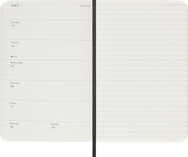 De Moleskine Weekly Notebook Planner is gedateerd van januari tot december. Het is een handige en veelzijdige planner die de vrijheid van een notitieboekje bevat en is ingedeeld met de afspraken van de week aan de linkerkant en een gelinieerde pagina voor notities op de rechter bladzijde. Het notitieboekje is beschikbaar met een harde of een zachte kaft met afgeronde hoeken en een elastische sluiting.