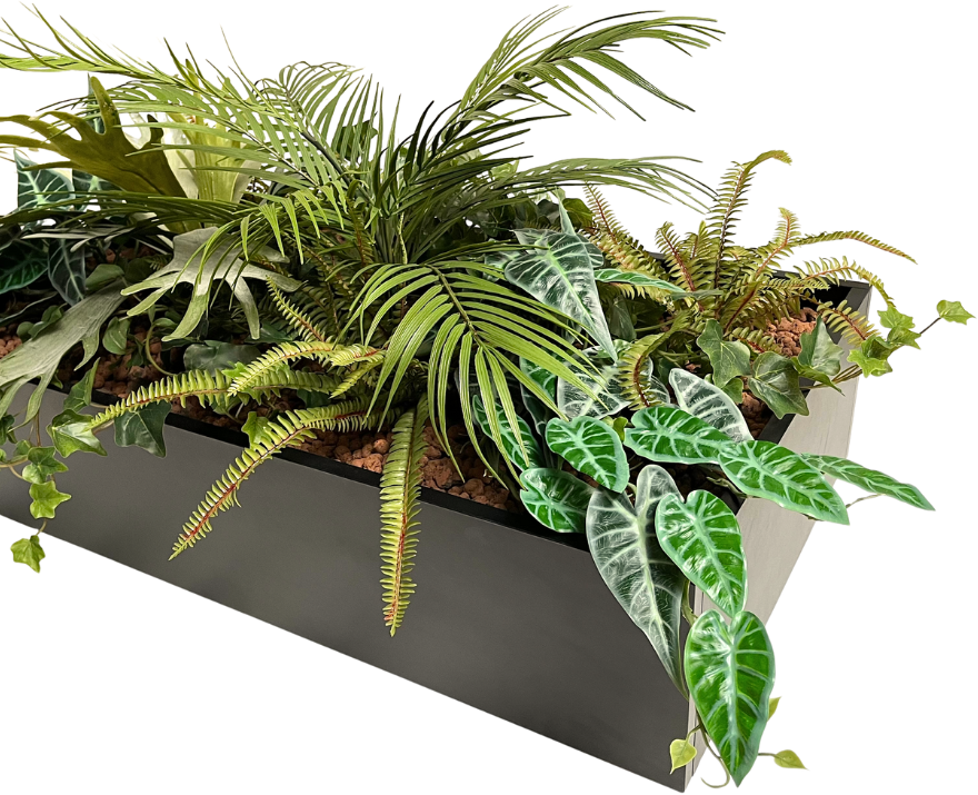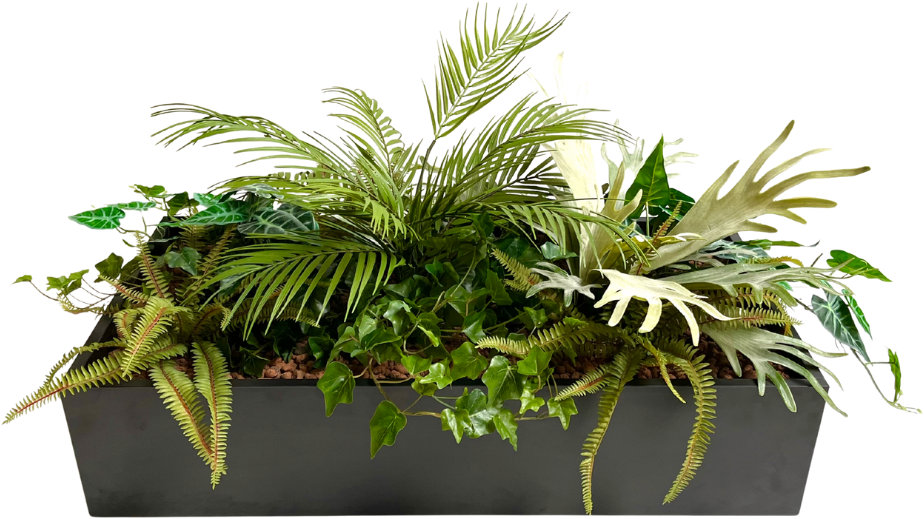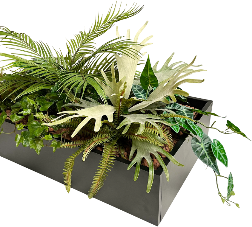 Deze premium kunstplantenmix bestaat uit realistische varens, hedera, platycerium en alocasia. De combinatie van verschillende bladvormen, hoogtes en kleurtinten zorgt voor een volle en natuurlijke uitstraling. Ideaal voor kantoren, ontvangstruimtes, horecalocaties en projectinrichtingen waar sfeer belangrijk is zonder onderhoud.