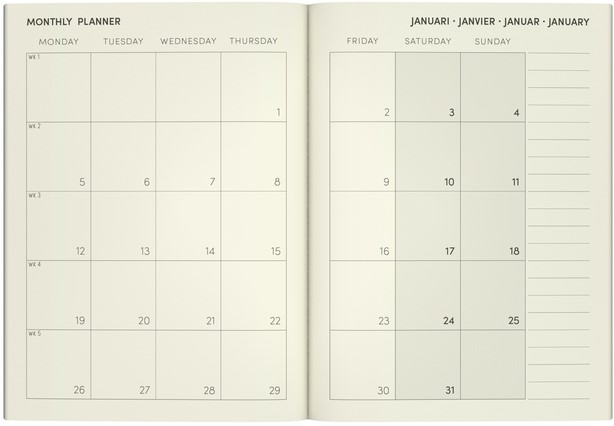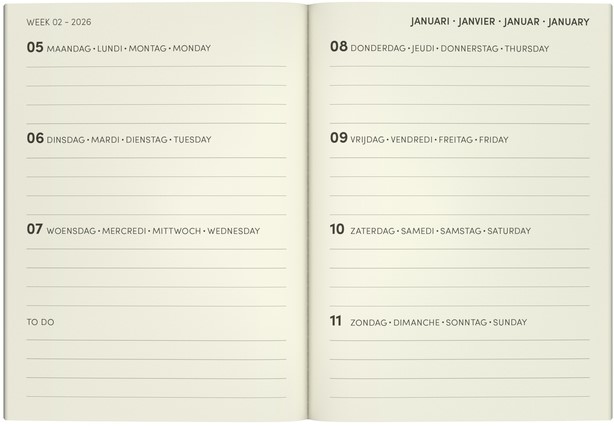 Met deze frisse elegante 'Papier Découpé' agenda, hou je al je afspraken overzichtelijk bij de hand! Binnenin vind je telkens 7 dagen op 2 pagina's, een maandplanner en ruimte voor nota's, op crèmekleurig papier. Het binnenwerk is in het Nederlands, Frans, Duits en Engels. De harde kaft heeft een matte finish en een praktische elastische sluiting om alles op zijn plek te houden