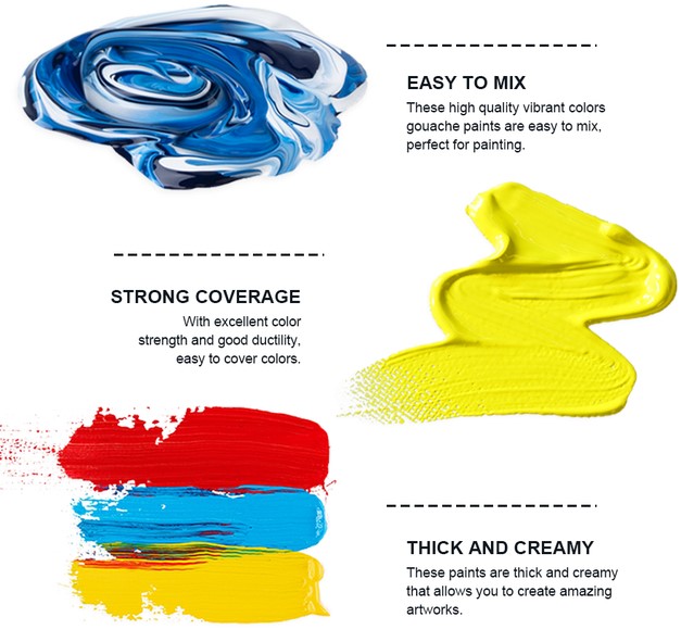 Elke kleur heeft een inhoud van 30 ml. En heeft een fantastische dikke consistentie die penseel- of spatelafdrukken zal vasthouden en je werk schitterende textuur zal geven. De premium gouache-verfset met 18 unieke opvallende levendige gouache kleuren biedt je een uitstekende selectie van levendige kleuren om je kunstwerk tot leven te brengen, ideaal voor professionele kunstenaars, jonge aspirant-kunstenaars, schilderliefhebbers, tieners en kinderen. Verbeterd en uniek ontwerp met minicups met uitstekend afdichtingsdeksel houdt je gouache-verf nat en romig voor prachtige schilderwerkjes, draagbaar formaat, gemakkelijk mee te nemen, perfect om binnen of buiten te leren schilderen. Gemaakt van milieuvriendelijk verfmateriaal met de certificeringen ACMI, EN71-3 en EN71-9. De gouache-verf van deze set heeft rijke pigmenten, is romig, niet giftig en wasbaar. Geschikt voor kunstenaars, volwassenen, tieners en kinderen. De verf zal niet barsten of afbrokkelen wanneer ze droog is en kan worden gereactiveerd met water. De nieuwe gouache-verfset wordt geleverd met een eenvoudig palet.