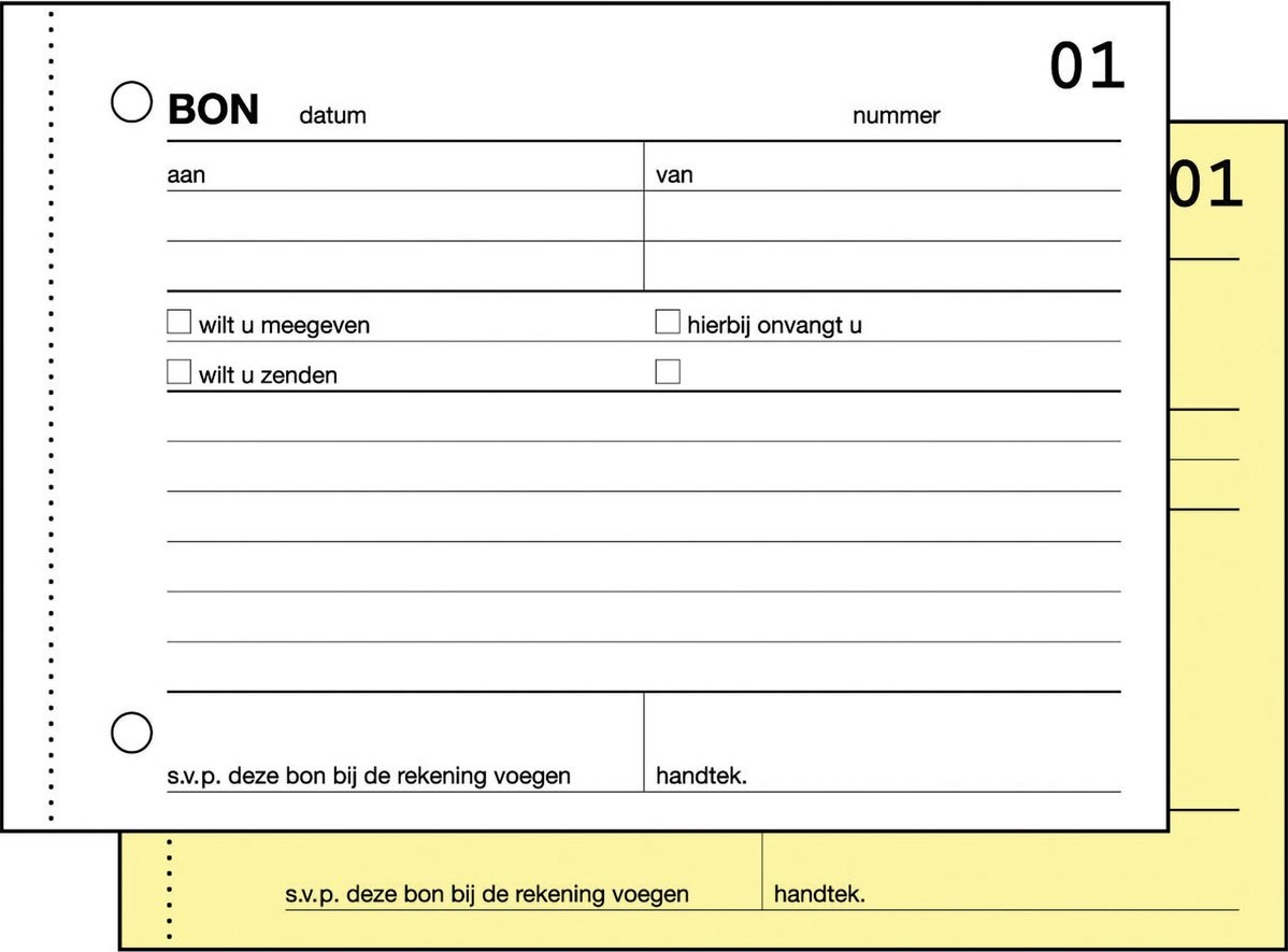 Ft 10,5 x 14,8 cm (A6) Papier van 60 g/m² Dupli (50 x 2 vel), zelfkopiërend Met 2-gaatsperforatie Genummerd Nederlandstalig