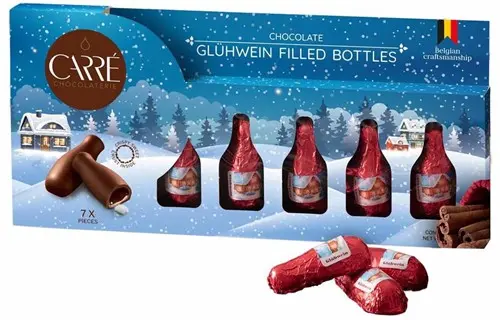 Belgische chocolade met glühweinlikeur Pure chocolade in de vorm van elegante flesjes Verpakt in een stijlvolle windowbox Doos van 86 gram