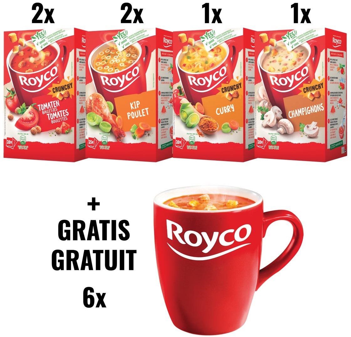 2 x Royco Minute Soup tomaat met balletjes, pak van 20 zakjes (Ref. 046730) + 2 x Royco Minute Soup kip, pak van 25 zakjes (Ref. 46710) + 1 x Royco Minute Soup curry met croutons, pak van 20 zakjes (Ref. 46610T) + 1 x Royco Minute Soup champignons, pak van20 zakjes (Ref. 46570) + 1 x Royco Minute Soup mok, doos van 6 stuks GRATIS (Ref. Mokroy)