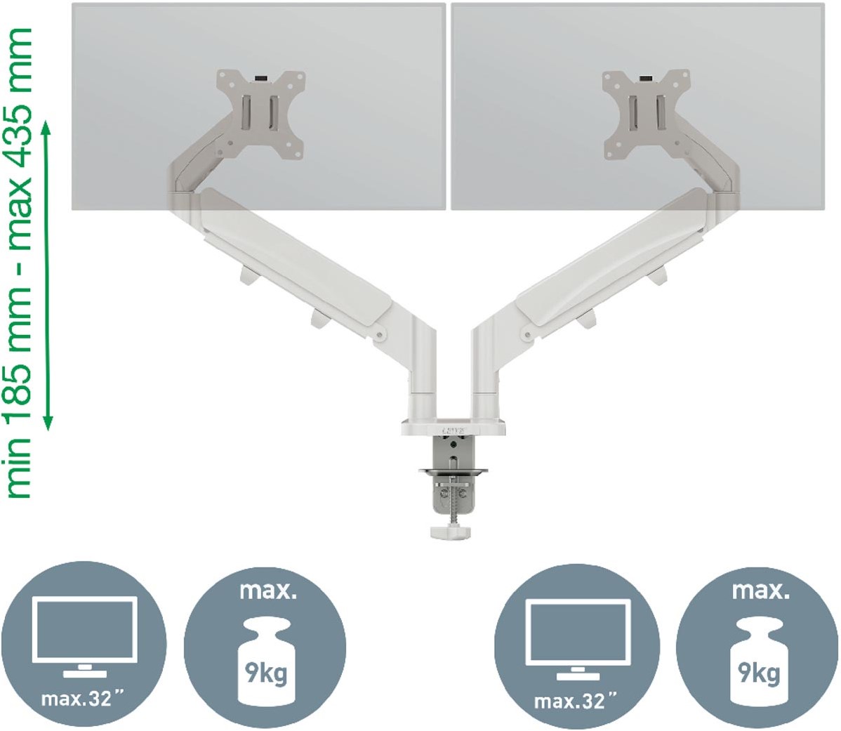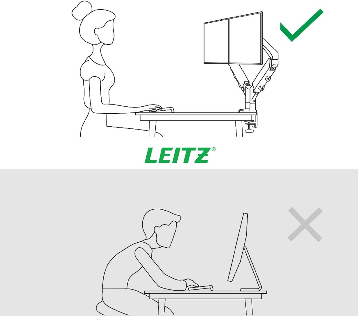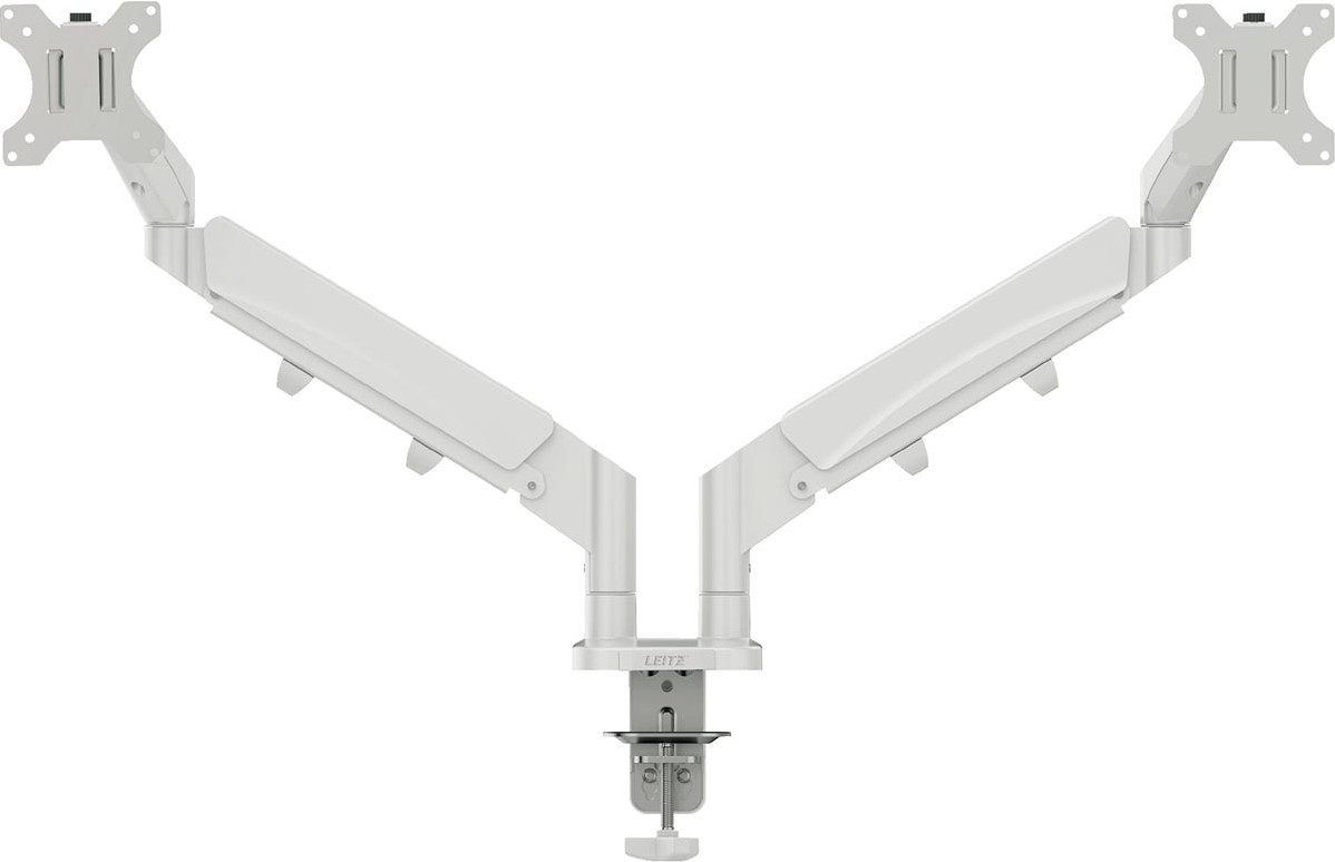 Artikelomschrijving Leitz Ergo ruimtebesparende monitorarm, dubbel, lichtgrijs