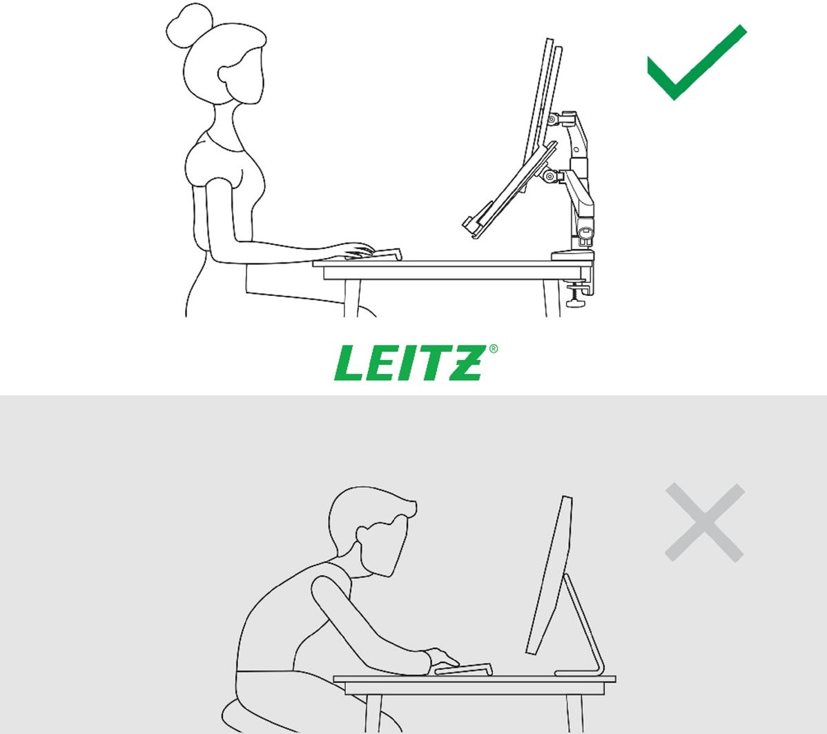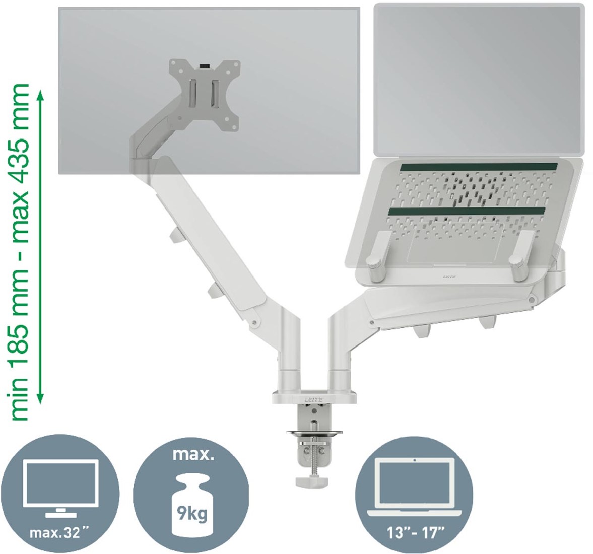 Artikelomschrijving Leitz Ergo ruimtebesparende monitorarm, dubbele arm met 1 laptoparm, lichtgrijs