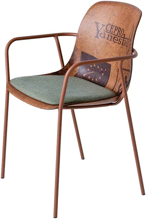 Deze stoel van Vepa Hemp Coffee is een upcycling van koffiezakken.