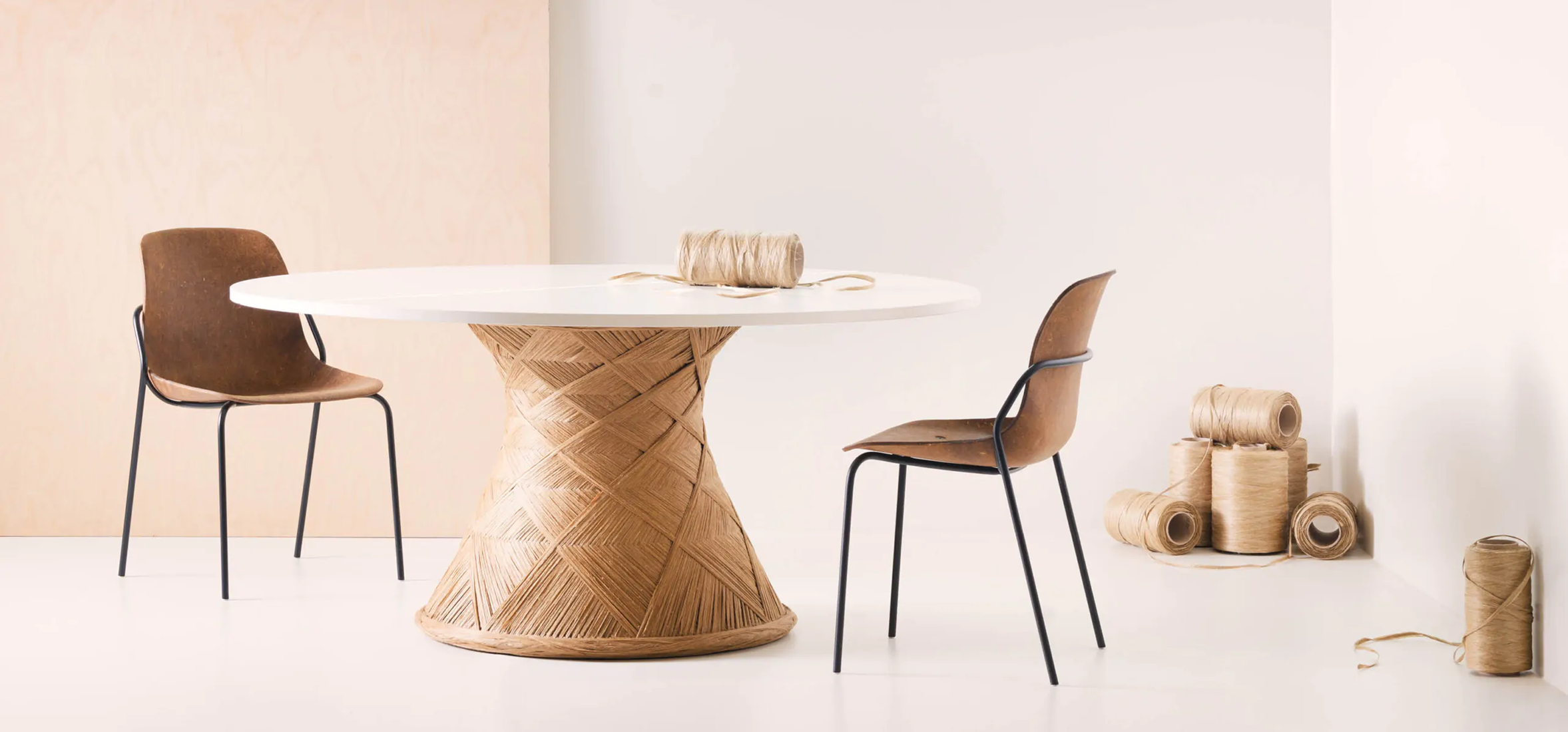 De kolompoot van Flax is net als de stoelkuip van Hemp volledig plantaardig, biologisch en recyclebaar. De poot is gemaakt van vlas en biohars die op een unieke manier geproduceerd wordt. Bij filament winding wordt vezeldraad in dit geval vlas onder spanning over een roterende mal gewikkeld. Het resultaat is een prachtige, unieke, 3D gespannen kolompoot waarop een tafelblad gemonteerd wordt.