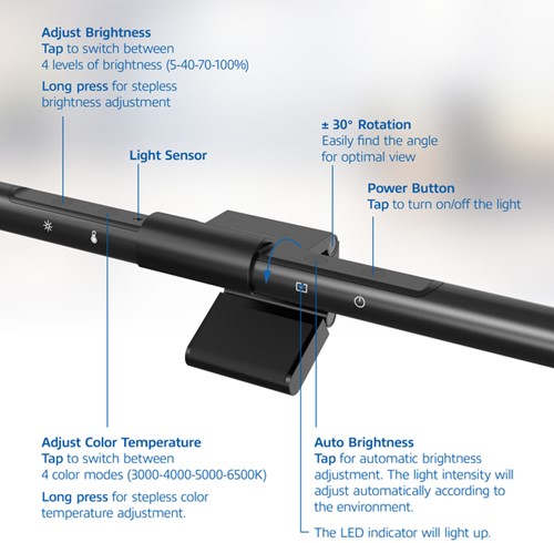 De monitor ledlamp heeft een automatische helderheid-functie die zich aan het omgevingslicht aanpast. De lamp levert zelf de juiste hoeveelheid licht. Wil je dit toch liever zelf bepalen? Dan zet je deze functie heel gemakkelijk zelf uit.