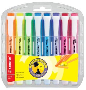 Stabilo Markeerstift Swing Cool plastic etui van 8 stuks: geel, groen, lichtblauw, donkerblauw, oranje...