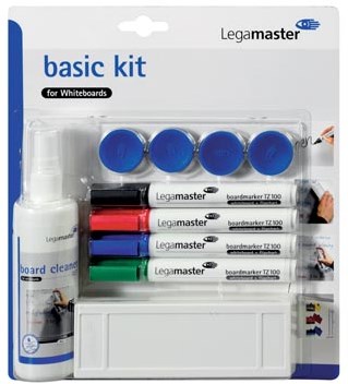 Inhoud: 4 whiteboardmarkers TZ 100 blauw rood groen en zwart 1 kleine bordenwisser 1 reinigingsspray TZ van 125 ml 4 magneten met een diameter van 30 mm