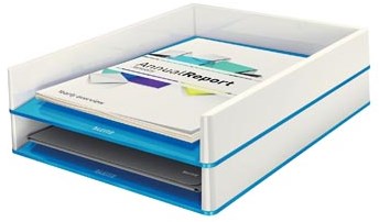 Organiseer je bureau met het Leitz WOW brievenbakje in blauw met wit. Bestel vandaag nog en geniet van een opgeruimd thuiskantoor!
