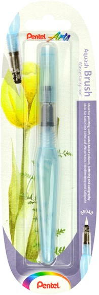 Aquash brush. Pen met sterke niet vervormbare penseelpunt. Het transparante handvat is tevens waterreservoir. Geen apart waterbakje zodat er overal en zelfs onderweg in de auto, bus of trein mee gewerkt kan worden. Inhoud waterreservoir 10ml. Nieuw geleidesysteem zorgt ervoor dat, afhankelijk van het indrukken van de houder, de penseelpunt exact de gewenste watertoevoer krijgt. Gemakkelijk te reinigen. Penpunt: Breed