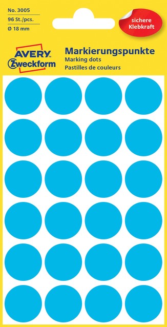Stel een vraag over Etiket Avery Zweckform 3005 rond 18mm blauw 96 etiketten