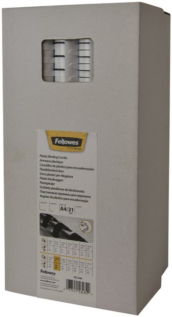De Fellowes inbindringen zijn gemaakt om uw documenten goed te beschermen en op orde te houden. Om uw kantoorwerk net en georganiseerd te houden Met 21 plastic bindruggen zorgt het voor strakke en fraaie presentatie. Door gebruik te maken van deze bindruggen weet u zeker dat de documenten die u inbind stevig ingebonden zullen blijven en niet beschadigd zullen worden. Met een inbindcapaciteit van 150 pagina's is dit de perfecte hoeveelheid voor een groot en uitgebreid verslag. Voor een mooie afwerking en bescherming van uw producten.