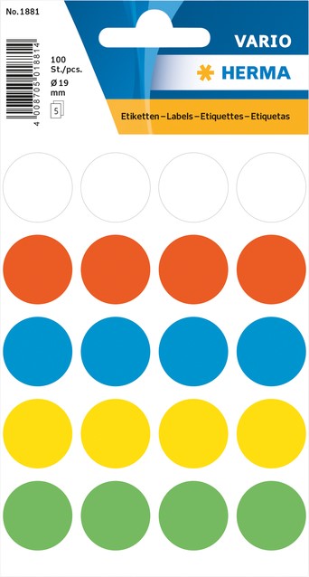 Stel een vraag over Etiket HERMA 1881 rond 19mm assorti 100stuks