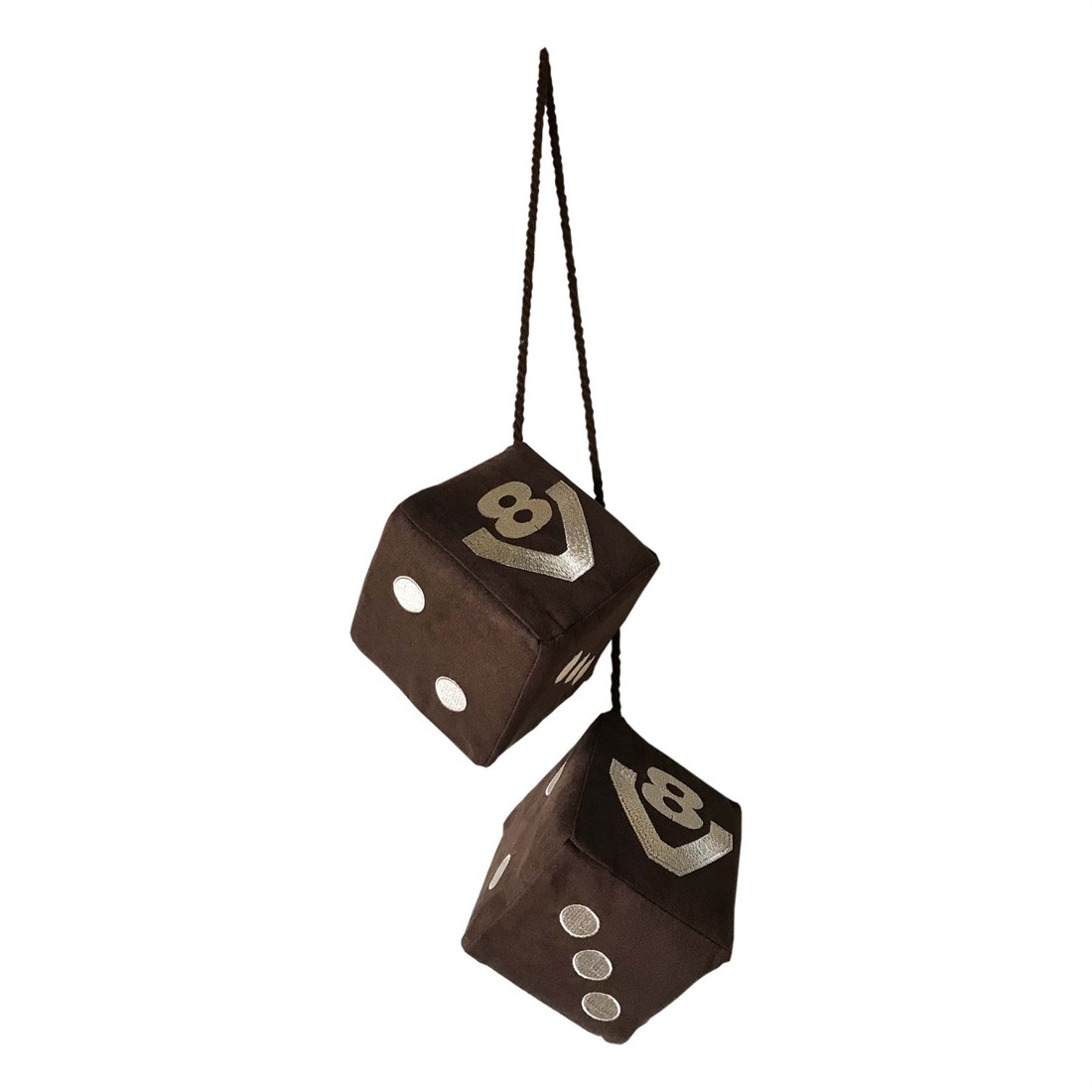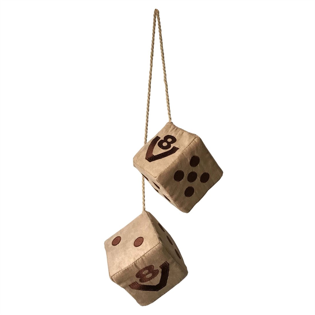 Dobbelstenen van Alcantara stof met gestikt V8 logo.