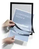 Met het Durable Duraframe A4 zwart zelfklevend presenteer je documenten op een duidelijke en professionele manier. Dit informatiekader heeft een magnetische rand, waardoor je snel en eenvoudig documenten kunt vervangen. Het is geschikt voor alle effen en gladde ondergronden, zoals glas. Dit maakt het ideaal voor het tonen van deurborden, signalisatie en aanbiedingen. Het kader is leesbaar van beide zijden wanneer het op glas is bevestigd. De rand heeft dezelfde kleur aan de voor- en achterzijde, wat zorgt voor een nette uitstraling. Je kunt het zowel in staand als liggend formaat gebruiken.