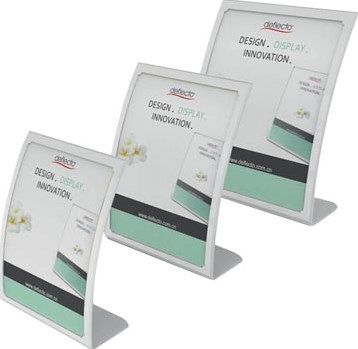 Elegant en nieuw design. Met gebogen vorm voor een goede visibiliteit. Uit transparant polystyreen. Folder kan snel aangepast worden. Ideaal voor aan recepties of op toonbanken.