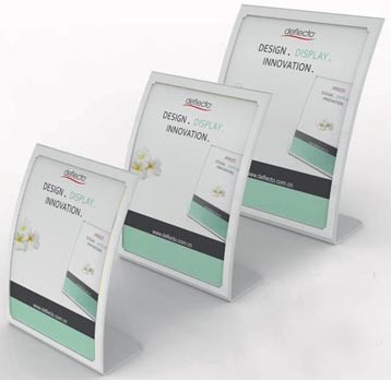 Deze kaarthouder voor folders of andere communicatiemiddelen heeft een gebogen vorm.