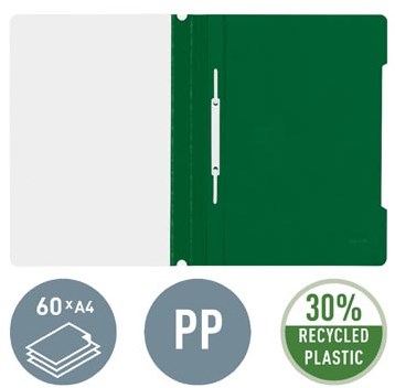 Gebruik een snelhechter voor het gehecht opbergen en bundelen van documenten. De map heeft een snelhechtermechaniek waarmee je snel documenten kunt samenbinden. De transparante voorkaft en groene achterzijde van PVC geven de map een professionele uitstraling