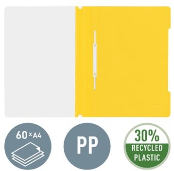 Gebruik een snelhechter voor het gehecht opbergen en bundelen van documenten. De map heeft een snelhechtermechaniek waarmee je snel documenten kunt samenbinden. De transparante voorkaft en gele achterzijde van PVC geven de map een professionele uitstraling