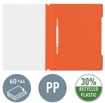 Gebruik een snelhechter voor het gehecht opbergen en bundelen van documenten. De map heeft een snelhechtermechaniek waarmee je snel documenten kunt samenbinden. De transparante voorkaft en oranje achterzijde van PVC geven de map een professionele uitstraling