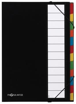 Voor A4 formaat. Met geplastificeerde kaft en elastieken. Met 12 vakken in verschillende kleuren. Kleur: zwart.