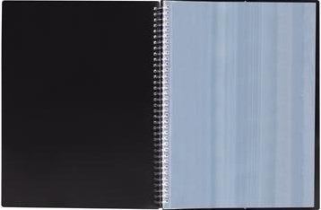 Specificaties: A4 Uit PP met labyrint reliëf Met spiraal om 360 graden open te leggen 40 glasheldere tassen Met elastieksluiting