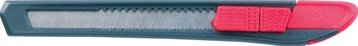 Plastic cutter. Mes van 9 mm. Standaard mesjes, intrekbaar. Veiligheid: manueel blokkeren van het mesje. Kleur: grijs/rood. Geleverd met 10 extra mesjes. Op blister.