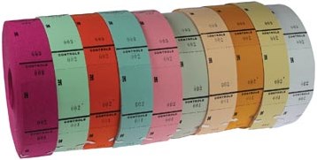 Rol met 1.000 tickets, ft 65 x 30 mm, met controlestrookje. Per rol genummerd van 1 tot en met 1.000.