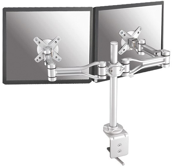 Met deze Neomounts monitorarm, model FPMA-D1030D, bevestigt u twee flatscreens aan het bureau via een bureauklem.