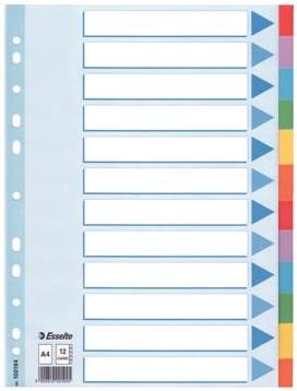 A4 formaat. Uit gerecycled karton van 160 g/m². Met kartonnen voorblad van 130 g/m². 11-gaatsperforatie. Perforatiegaten versterkt met transparante polyesterfolie. Met gekleurde tabs.