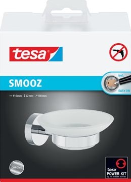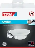 De Tesa® Smooz zeephouder heeeen aantrekkelijk afgerond ontwerp dat wordt benadrukt door het gesatineerde glas van de schaal en wordt aangevuld door de glanzend verchroomde afwerking van de beugel