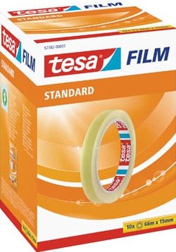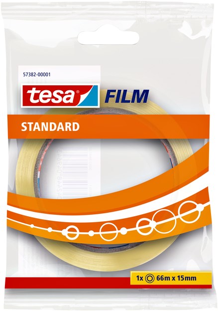 tesafilm® Standard is de tape voor algemeen gebruik in uiteenlopende situaties. Het is een zeer multifunctionele kantoortape en mag ook thuis niet ontbreken als universele hobbytape. Deze transparante tape is vrij van pvc en giftige oplosmiddelen en combineert sterke hechtkracht met grote bestendigheid tegen uv-licht en veroudering. De tape rolt stil af en kan met de hand op de gewenste lengte worden afgescheurd. De tape kan ook worden gebruikt met een van de tesafilm® hand- en bureautapedispensers. Belangrijkste eigenschappen: transparant goede kleefkracht duurzaam rolt makkelijk af PP folie vrij van oplosmiddel