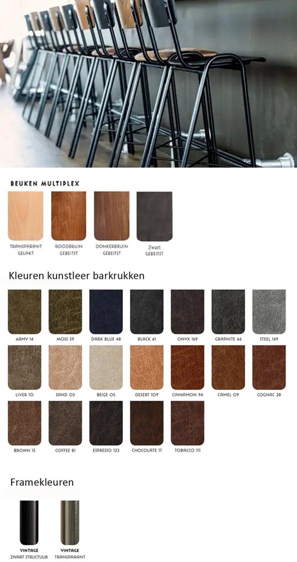 Verkrijgbaar in 19 moderne kleuren kunstleer, waaronder cognac, antraciet, legergroen, lever, camel, coffee en chocolade. De warme tinten sluiten perfect aan bij industriële interieurs.