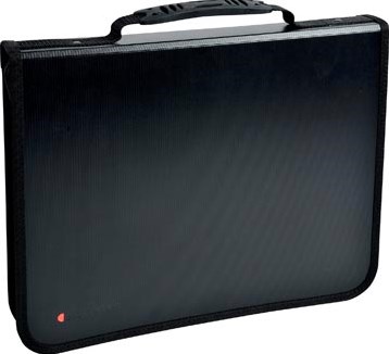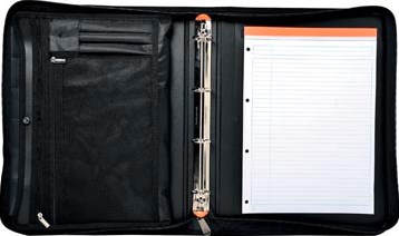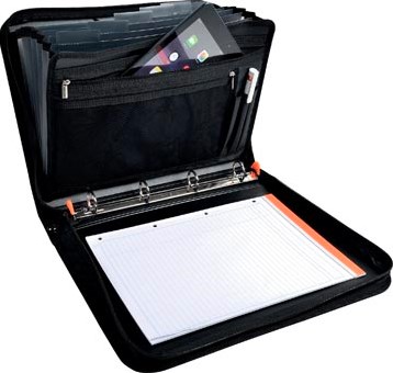 Voorzien van plaats voor notablok A4 of schrikaarten pennenhoes en vakken voor het klasseren van losse documenten