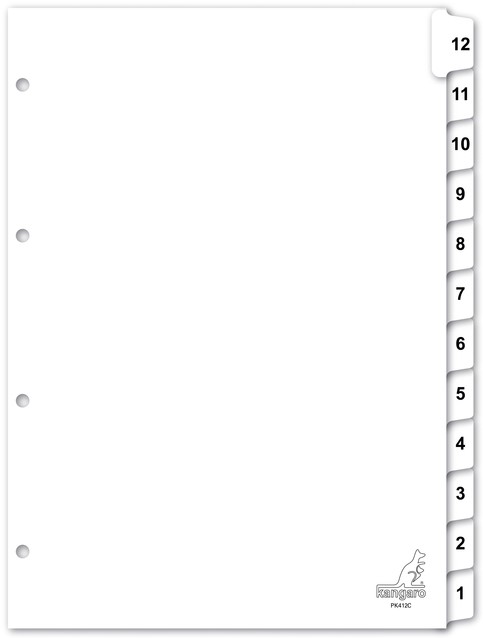 Stel een vraag over Tabbladen Kangaro 4-gaats PK412C 1-12 genummerd wit karton
