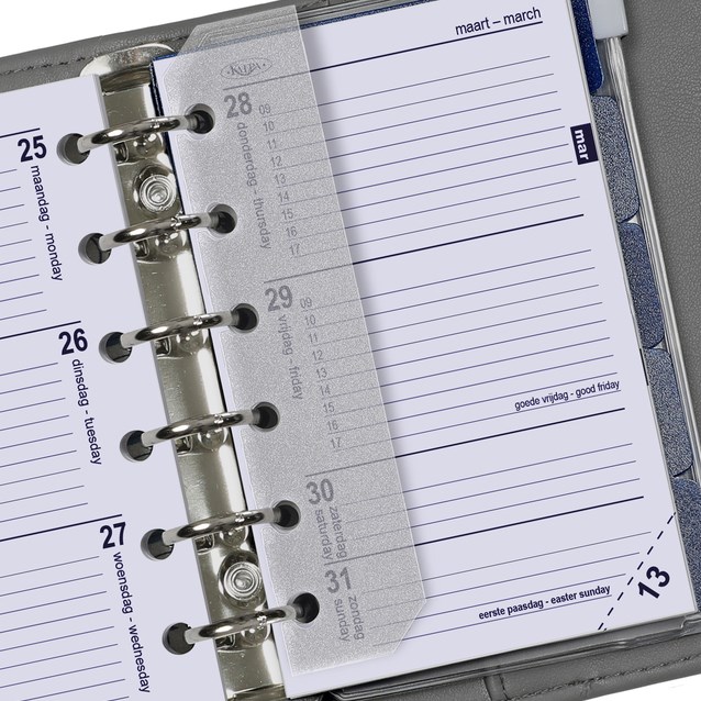 Bij deze agendavulling met pocketformaat heb je een week agenda per 2 pagina's. De agenda maakt het makkelijk om afspraken of activiteiten te noteren. Bij de jaardoos krijg je het complete calendarum (no 6237-25). Naast het agendagedeelte krijg je extra 5 tabbladen, een adresset, paginascheider, een ritshoesje en een bewaardoos die je ook kunt gebruiken om de agendavulling van vorig jaar te bewaren. De agendavulling bestaat uit 160 pagina's wit papier met blauwe opdruk, met één week per pagina en een tijdsindeling van 9:00 uur tot 18:00 uur. Deze agendavulling is te gebuiken met personal organizers van vele populaire merken, waaronder Kalpa, Succes Standaard, en Filofax.op pocket formaat