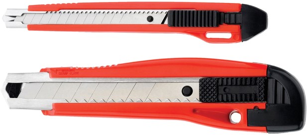 Premium snijmes met 9mm óf 18mm breed snijblad. Het breekmes is voorzien van afbreekbare mesjes. Het mes heeft een rode kunststof houder met metalen snijgeleider en een schuifknop voor het snijblad. 1 stuk