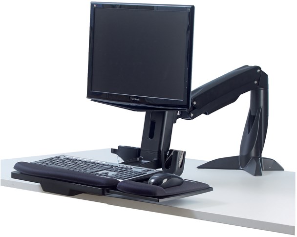 Een slimme Zit-Sta oplossing met inklapbare toetsenbordlade en ruimte voor accessoires.