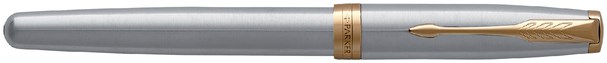 De vulpen is gecomplementeerd met vergulde afwerkingen en een edelstalen penpunt, bedekt met een vergulde afwerking