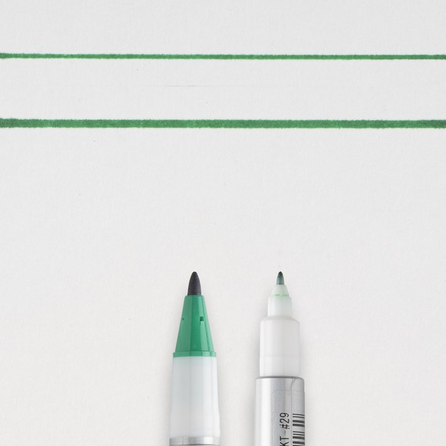 Beide uiteinden van de Sakura Marker IDenti Pen heeft een penpunt: een dunne glasvezelpunt (0,4mm) voor gedetailleerd werk en een brede kunststofpunt (1,0mm) voor het reguliere schrijfwerk